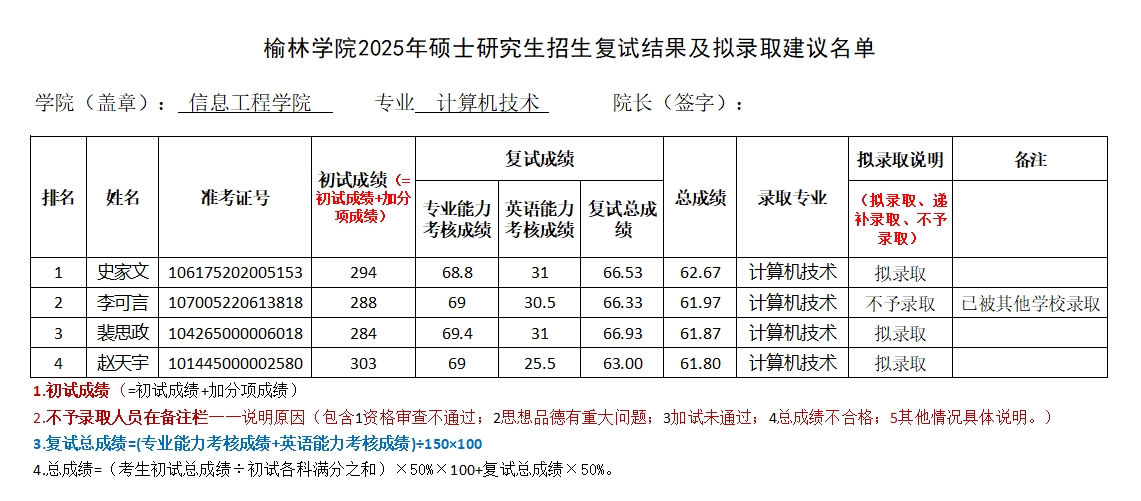 根据《2025年硕士研究生招生复试录取工作实施细则》,公司对调剂考生进行了复试。公司新增3个名额,现将参加调剂复试考生递补结果予以公示: