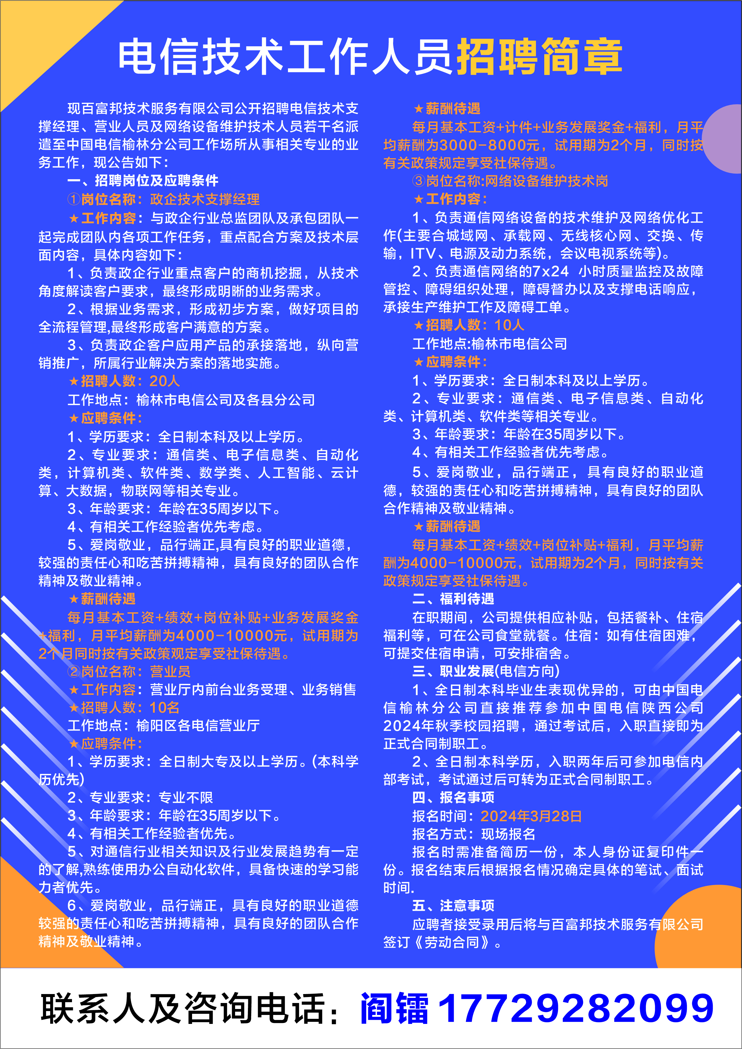 现百富邦技术服务有限公司公开招聘电信技术支撑经理、营业人员及网络设备维护技术人员若干名派遣至中国电信榆林分公司工作场所从事相关专业的业务工作,现公告如下:
