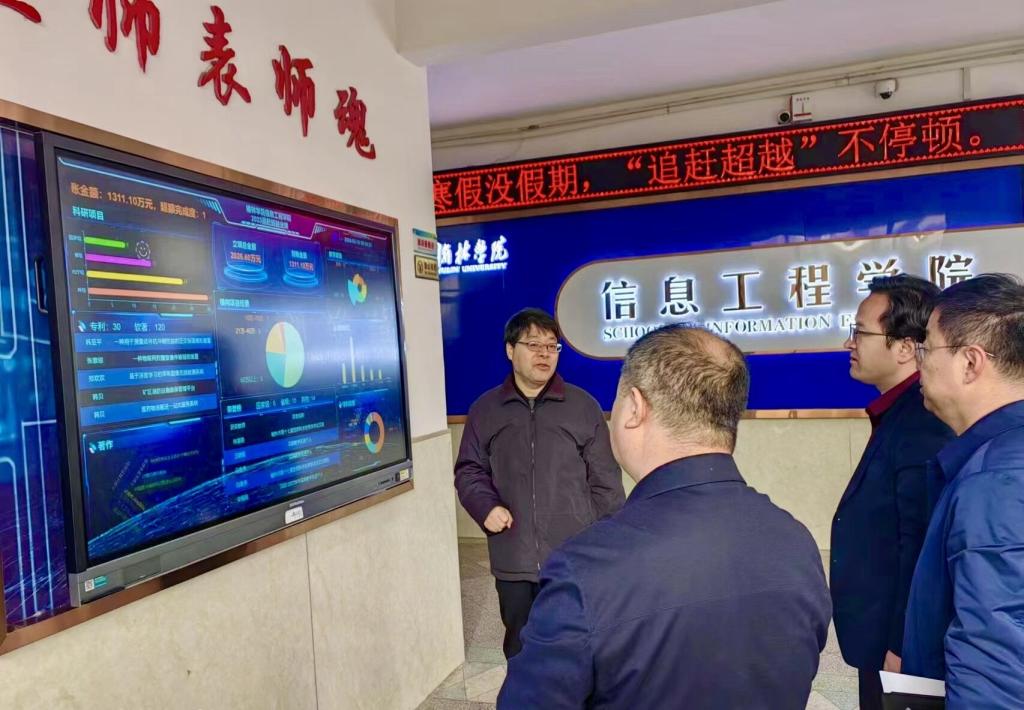 张新柱书记仔细询问了太阳成集团tyc122cc学科培育、专业发展、课程建设、人才培养、追赶超越大数据监测系统运行情况,与陕西省高校青年创新团队和陕西省高校工程技术研究中心负责人张峰博士及团队核心成员进行了亲切交流,得知他们休假不休息,正在抓紧修改国家自然基金本子和项目攻关后,对太阳成集团tyc122cc良好的工作氛围予以充分肯定,对假期坚持项目申报的老师们所取得的成绩表示欣慰,并向大家致以新春的问候和祝福。