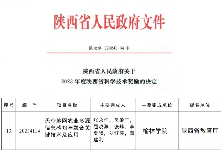 4月9日,陕西省人民政府公布了关于2023年度陕西省科学技术奖励的决定,公司大数据智慧团队申报的《天空地网农业多源信息感知与融合关键技术及应用》科研成果荣获陕西省科学技术进步奖三等奖。这是公司追赶超越三年来在科学技术领域获得的第3项省部级奖项,也是太阳成集团tyc122cc加强内涵建设发展,进一步推进创新发展、特色发展、高质量发展获得的又一标志性成果。