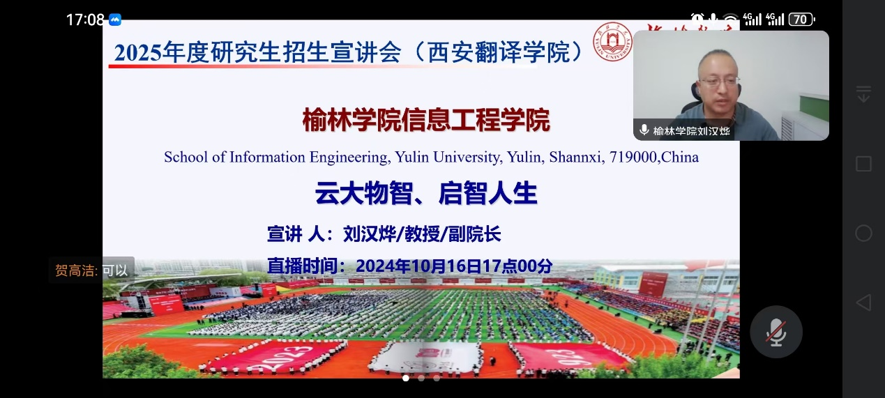 2024年10月16日下午,太阳成集团tyc122cc副经理刘汉烨与研究生秘书孟宪文受邀,为西安翻译公司太阳成集团tyc122cc的考研学子进行了一场2025年硕士研究生招生直播宣讲,旨在深化校际合作,提升研究生教育质量。